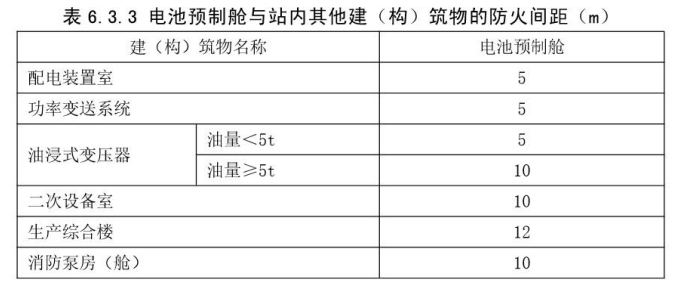 3.3電池預(yù)制艙與站內(nèi)配電裝置室、二次設(shè)備室、升壓變、PCS、生產(chǎn)綜合樓等建(構(gòu))筑物的防火間距不應(yīng)小于表6.3.3的規(guī)定(見文末);當(dāng)采用防火墻時(shí),防火間距不限。
