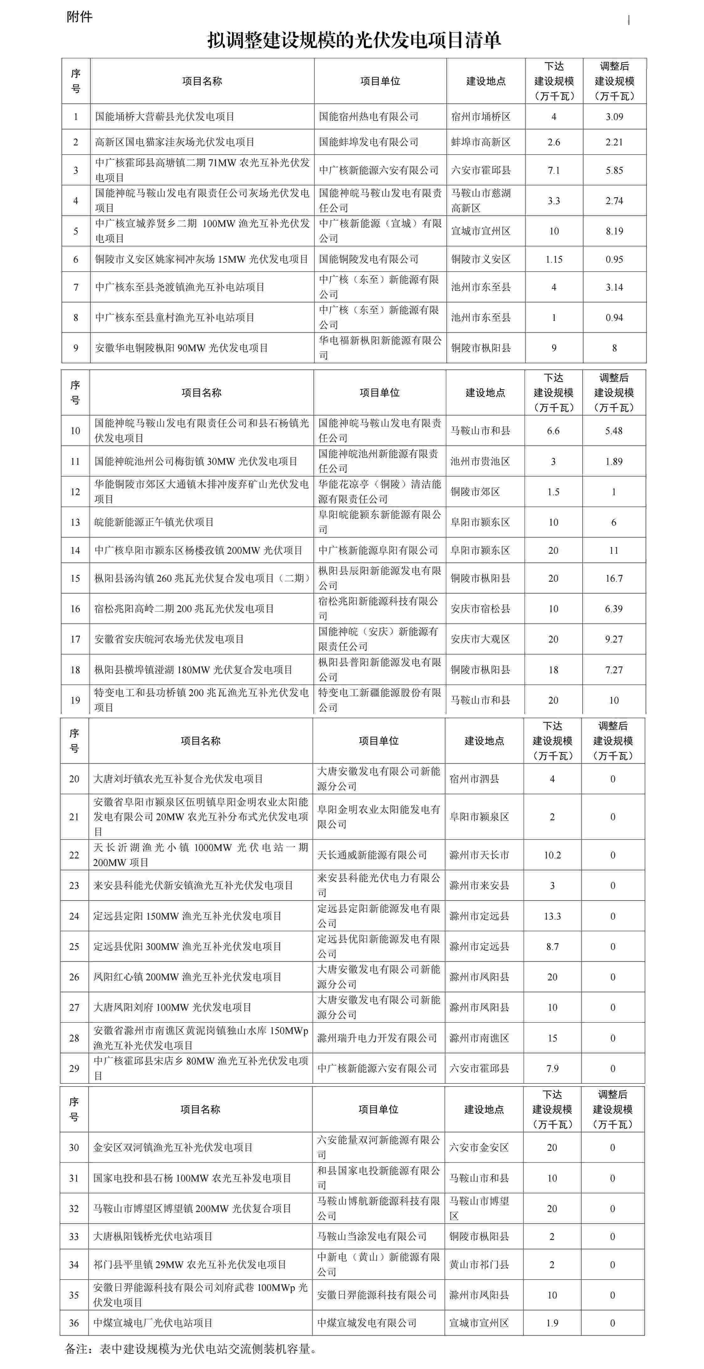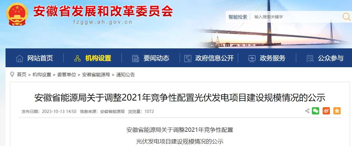 光伏園網(wǎng)站(www.uvhaut.com)獲悉,2023年10月13日,安徽省能源局發(fā)布《關(guān)于調(diào)整2021年競爭性配置光伏發(fā)電項目建設(shè)規(guī)模情況的公示》,文件對共計36個項目進(jìn)行了規(guī)模調(diào)整,其中取消指標(biāo)項目17個,消減指標(biāo)項目16個,共減少221.14萬千瓦,具體名單如下: