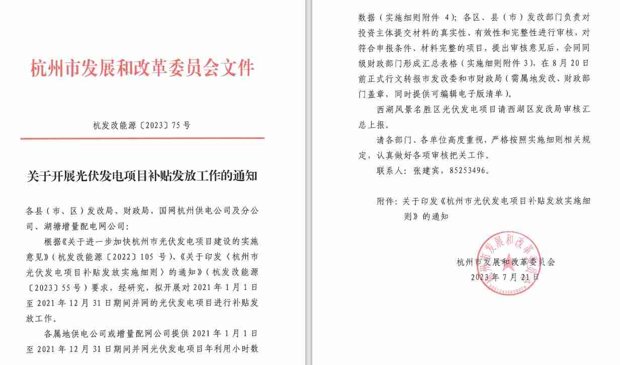 【補(bǔ)貼】杭州:實(shí)際并網(wǎng)容量給予 0.2 元/瓦一次性補(bǔ)助