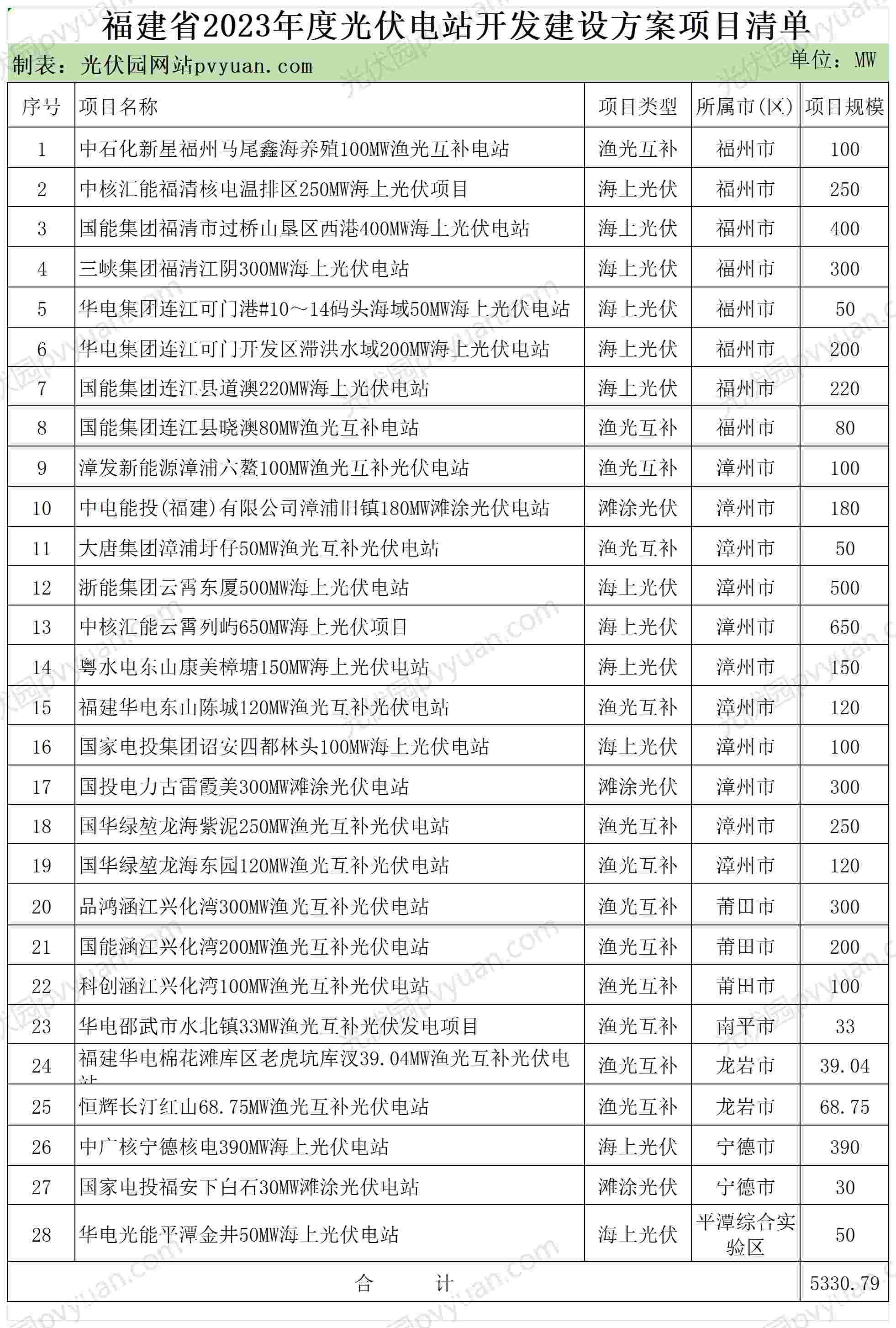光伏園網(wǎng)(pvyuan.cm)獲悉,2023年11月13日,福建省發(fā)改委下發(fā)了《2023年度光伏電站開發(fā)建設(shè)方案》的通知,本通知文件共公布了光伏項目28個,規(guī)模為5330.79MW,全部為涉水光伏項目,類型為市場化并網(wǎng)項目,且需按承諾配置儲能設(shè)施。