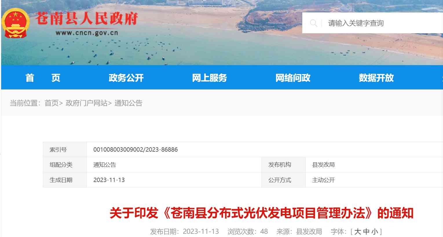 光伏園網(wǎng)(pvyuan.cm)獲悉,2023年11月13日,浙江蒼南縣人民政府發(fā)布關于印發(fā)《蒼南縣分布式光伏發(fā)電項目管理辦法》的通知,通知對資質(zhì)、安裝高度等進行了明確,全文如下。