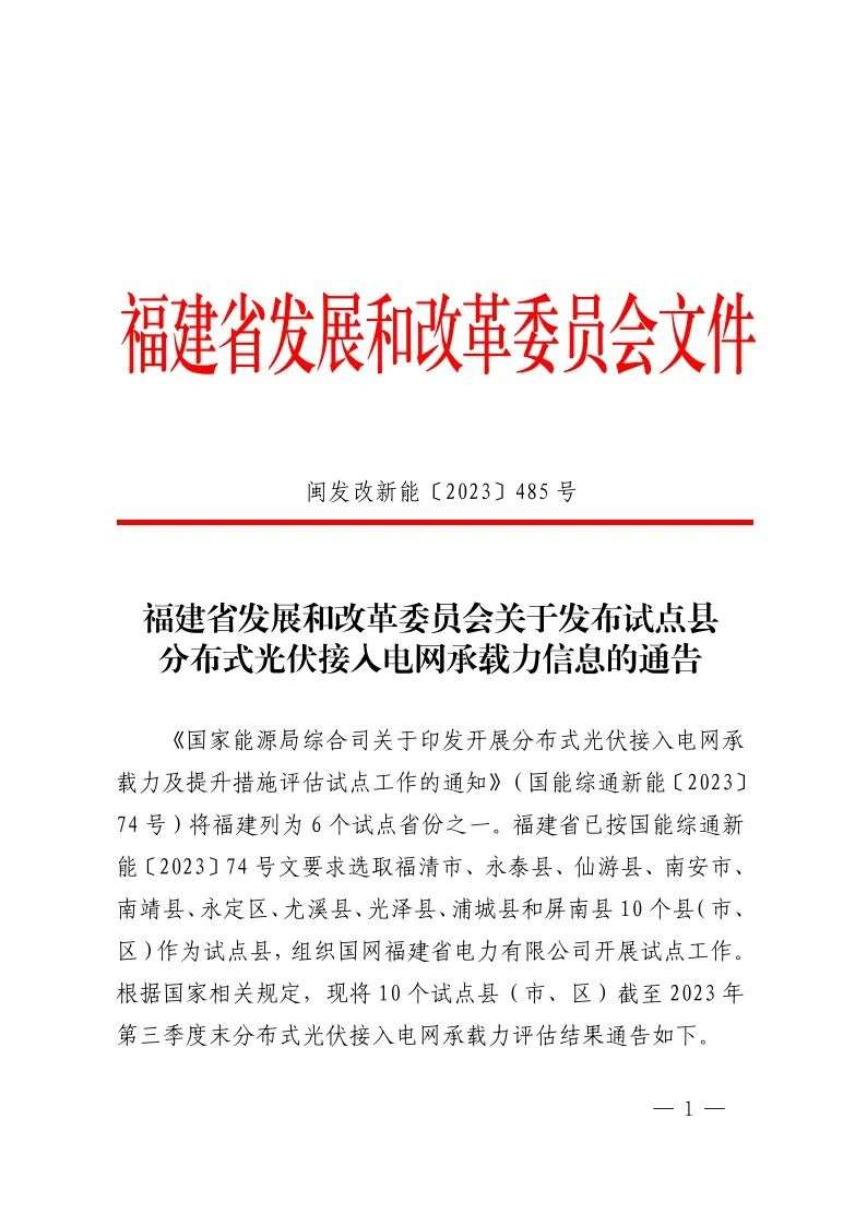 光伏園網(wǎng)站(www.uvhaut.com)獲悉,11月20日,福建省發(fā)改委發(fā)布《關(guān)于發(fā)布試點(diǎn)縣分布式光伏接入電網(wǎng)承載力信息的通告》。