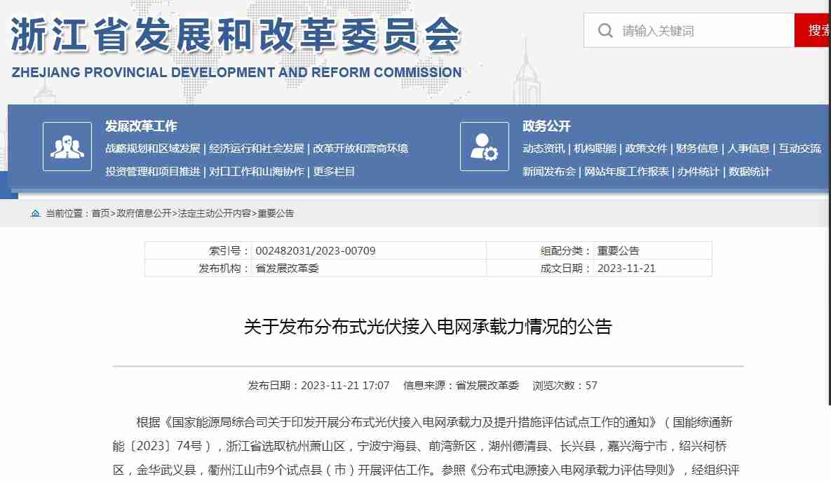 光伏園網(wǎng)站(www.uvhaut.com)獲悉,2023年11月21日,浙江省能源局發(fā)布《關(guān)于發(fā)布分布式光伏接入電網(wǎng)承載力情況的公告》,浙江省選取杭州蕭山區(qū),寧波寧??h、前灣新區(qū),湖州德清縣、長(zhǎng)興縣,嘉興海寧市,紹興柯橋區(qū),金華武義縣,衢州江山市9個(gè)試點(diǎn)縣(市)開展分布式光伏接入電網(wǎng)承載力評(píng)估工作,結(jié)果顯示僅江山市存在“低壓配網(wǎng)接網(wǎng)預(yù)警等級(jí)”一般預(yù)警,其余8縣分布式光伏接入不存在限制。原文如下: