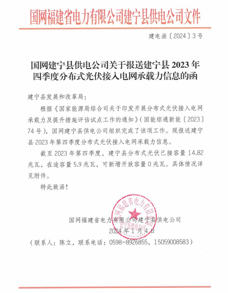 光伏園(www.uvhaut.com)獲悉,2024年1月4日,福建省三明市建寧縣人民政府發(fā)布《關(guān)于建寧縣2023年四季度分布式光伏接入電網(wǎng)承載力信息的復(fù)函》,復(fù)函顯示,截至2023年第四季度,建寧縣分布式光伏已接容量14.82MW,在途容量5.9MW,可新增開放容量為0MW。
