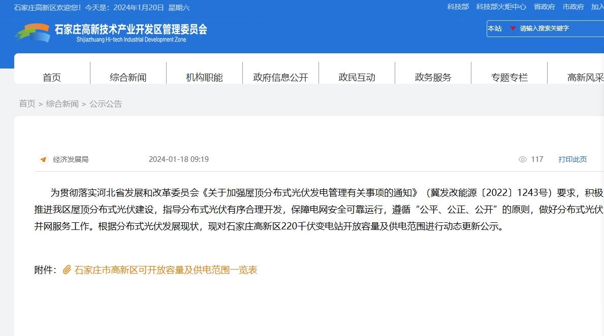 為貫徹落實(shí)河北省發(fā)展和改革委員會(huì)《關(guān)于加強(qiáng)屋頂分布式光伏發(fā)電管理有關(guān)事項(xiàng)的通知》(冀發(fā)改能源〔2022〕1243號(hào))要求,積極推進(jìn)我區(qū)屋頂分布式光伏建設(shè),指導(dǎo)分布式光伏有序合理開發(fā),保障電網(wǎng)安全可靠運(yùn)行,遵循“公平、公正、公開”的原則,做好分布式光伏并網(wǎng)服務(wù)工作。根據(jù)分布式光伏發(fā)展現(xiàn)狀,現(xiàn)對(duì)石家莊高新區(qū)220千伏變電站開放容量及供電范圍進(jìn)行動(dòng)態(tài)更新公示。