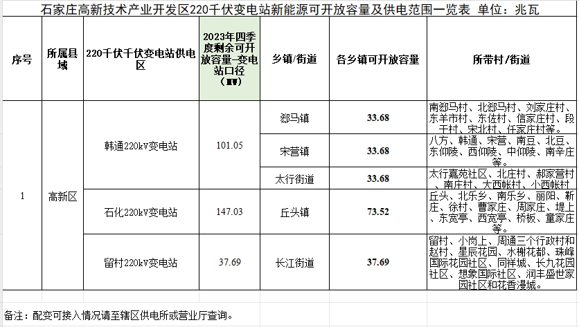 石家莊高新區(qū)220千伏變電站開放容量及供電范圍一覽表公示