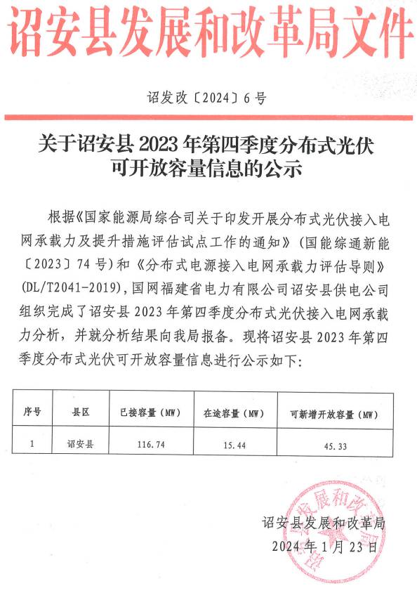 福建詔安:2023年第四季度分布式開放容量45.33MW