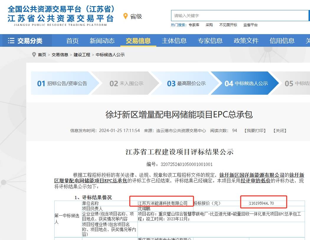 光儲園(微信pvyuan2)獲悉,2024年01月25日,江蘇省公共交易平臺發(fā)布《徐圩新區(qū)增量配電網(wǎng)儲能項目EPC總承包》中標公示。第一中標候選人為江蘇方洋能源科技有限公司,投標報價11619.59萬元,折合單價1.21元/Wh。