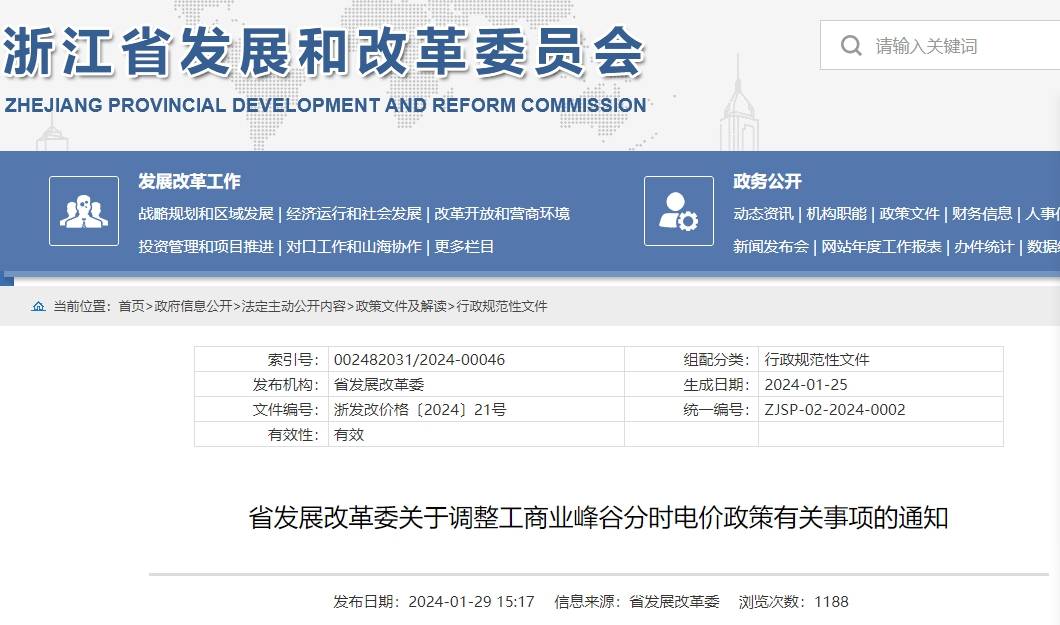 光伏園獲悉,2024年1月29日浙江省發(fā)改委發(fā)布《省發(fā)展改革委關(guān)于調(diào)整工商業(yè)峰谷分時電價政策有關(guān)事項的通知》,對分時電價進(jìn)行調(diào)整。新政策將于2024年3月1日開始執(zhí)行。全文如下:
