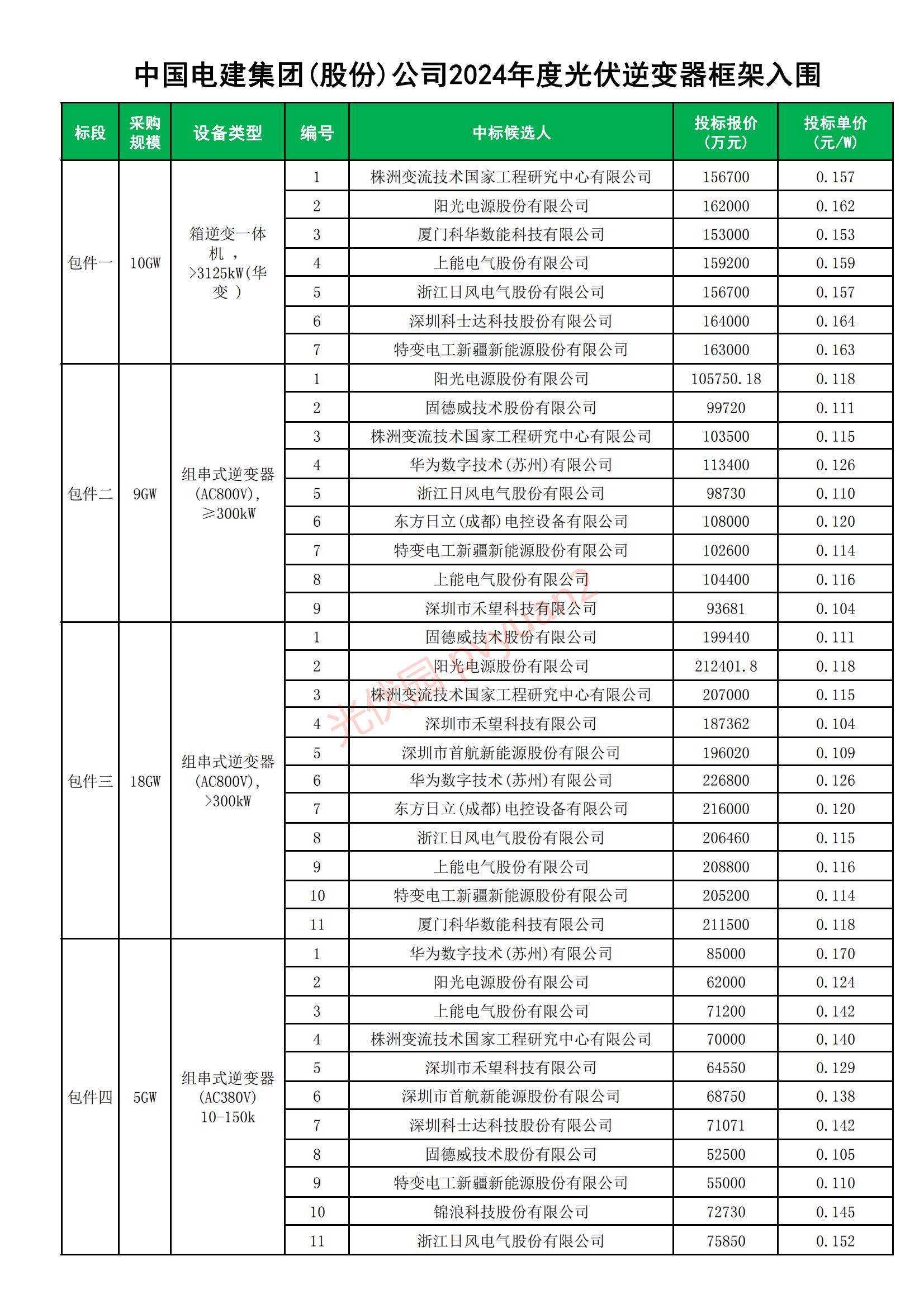 中國電建集團(股份)公司2024年度光伏逆變器框架入圍招標(biāo)總?cè)萘抗?2GW,分為四個包件,具體各家報價情況如下