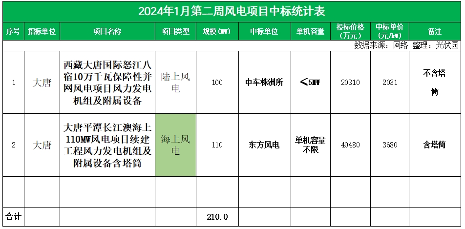24年1月第二周風(fēng)電整機(jī)采購(gòu)開(kāi)標(biāo)總計(jì)210MW,其中: