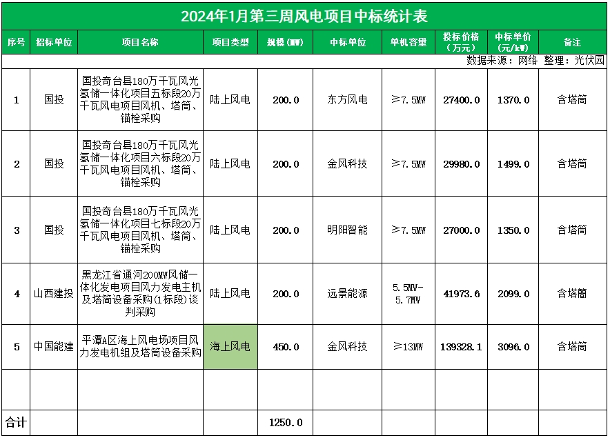 本周統(tǒng)計風(fēng)電整機采購開標(biāo)總計1250MW,其中: