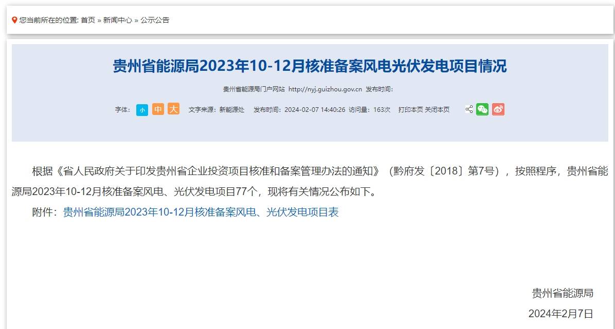 光伏園獲悉,2024年2月7日貴州省能源局發(fā)布《貴州省能源局2023年10-12月核準(zhǔn)備案風(fēng)電光伏發(fā)電項目情況》。