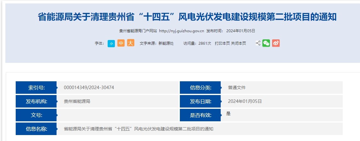 光伏園獲悉,2024年1月5日貴州省能源局發(fā)布《省能源局關(guān)于清理貴州省“十四五”風(fēng)電光伏發(fā)電建設(shè)規(guī)模第二批項(xiàng)目的通知》。