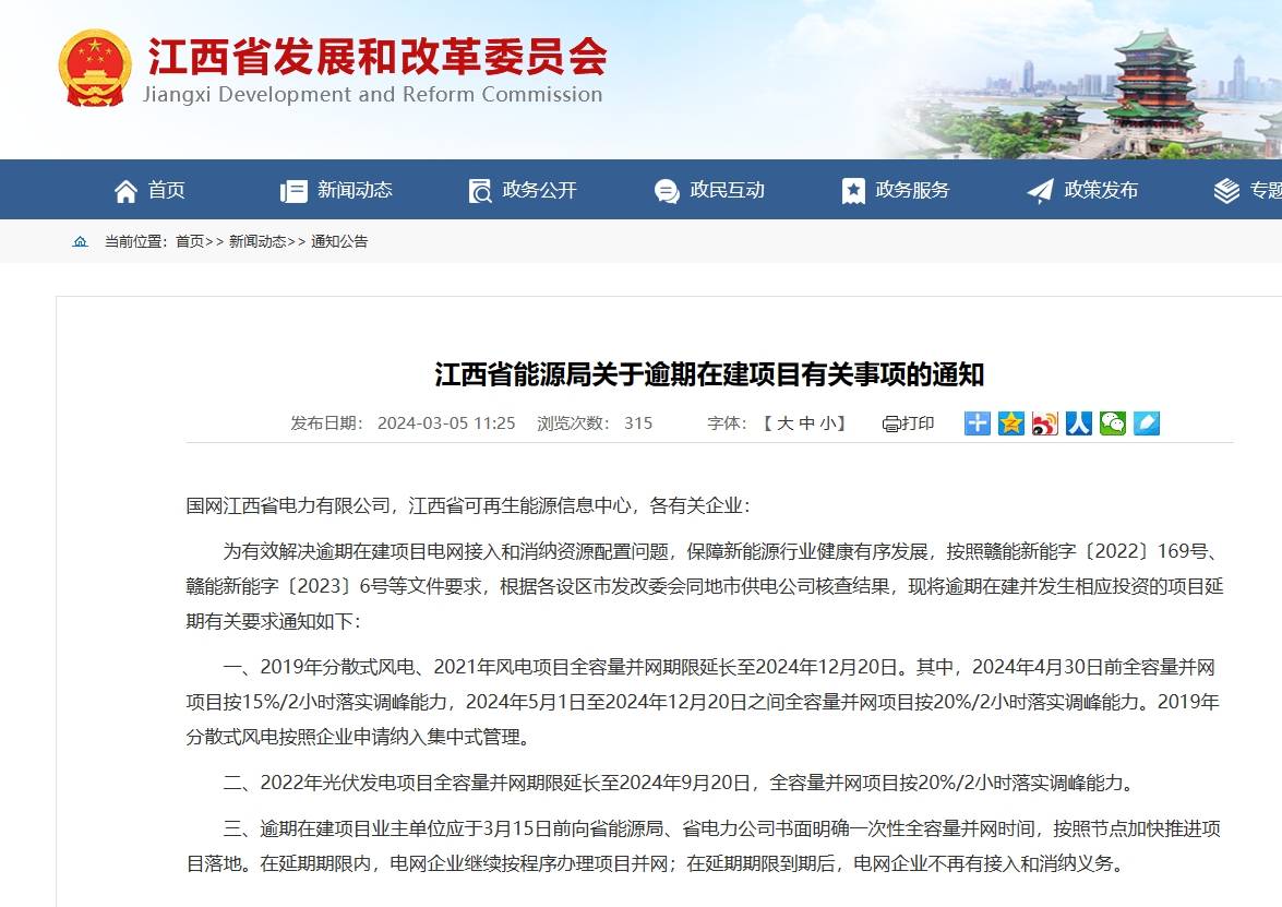 光伏園獲悉,2024年3月5日, 江西省發(fā)展和改革委員會(huì)發(fā)布《江西省能源局關(guān)于逾期在建項(xiàng)目有關(guān)事項(xiàng)的通知》,對(duì)對(duì)2019年分散式風(fēng)電、2021年風(fēng)電項(xiàng)目及2022年光伏發(fā)電項(xiàng)目的全容量并網(wǎng)時(shí)間進(jìn)行延期,并且要求落實(shí)配套儲(chǔ)能政策,要求通知如下:
