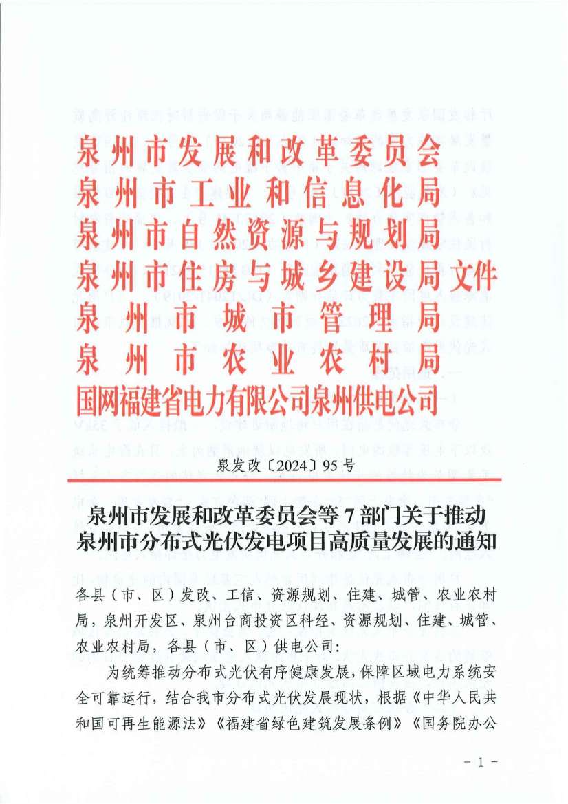 光伏園獲悉,近期泉州市發(fā)改委等多部門發(fā)布《泉州市發(fā)展和改革委員會(huì)等7部門關(guān)于推動(dòng)泉州市分布式光伏發(fā)電項(xiàng)目高質(zhì)量發(fā)展的通知》,對(duì)分布式光伏的安裝內(nèi)容進(jìn)行了規(guī)范。