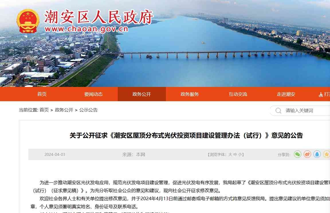 光伏園獲悉,近期廣東潮州市潮安區(qū)發(fā)展和改革局發(fā)布關(guān)于公開征求《潮安區(qū)屋頂分布式光伏投資項目建設(shè)管理辦法(試行)》意見的公告。光伏園梳理了本公告重點內(nèi)容: