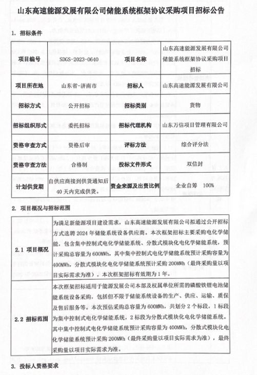 為滿足新能源項目建設需求,山東高速能源發(fā)展有限公司擬通過公開招標方式選聘2024年儲能系統(tǒng)設備供應商。此次框架招標主要采購電化學儲能,預計采購總容量為600MWh: