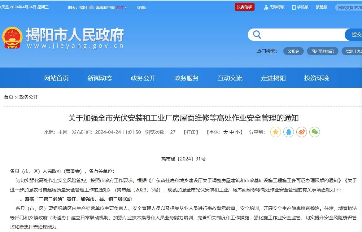 為切實(shí)強(qiáng)化高處作業(yè)安全風(fēng)險(xiǎn)管控,按照市政府工作要求,根據(jù)《廣東省住房和城鄉(xiāng)建設(shè)廳關(guān)于調(diào)整房屋建筑和市政基礎(chǔ)設(shè)施工程施工許可證辦理限額的通知》《關(guān)于進(jìn)一步加強(qiáng)農(nóng)村自建房質(zhì)量安全管理工作的通知》(揭市建〔2023〕3號(hào)),現(xiàn)就加強(qiáng)全市光伏安裝和工業(yè)廠房屋面維修等高處作業(yè)安全管理的有關(guān)事項(xiàng)通知如下:
