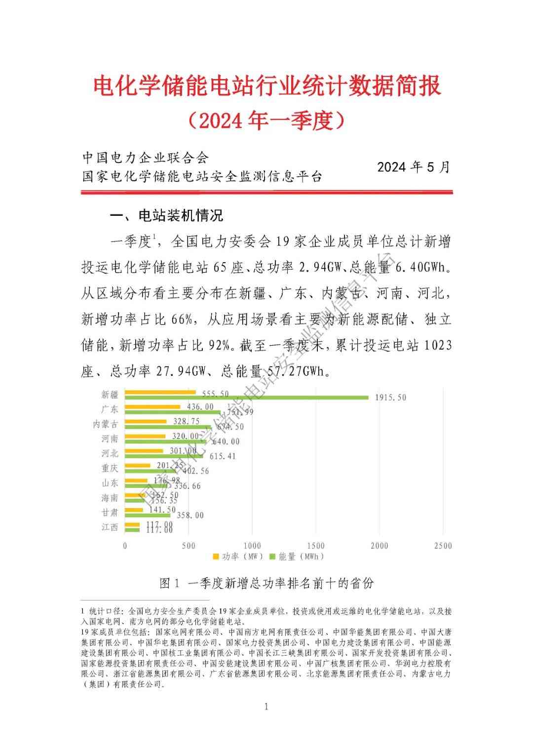 根據(jù)《簡(jiǎn)報(bào)》,一季度,全國(guó)電力安委會(huì)19家企業(yè)成員單位總計(jì)新增投運(yùn)電化學(xué)儲(chǔ)能電站65座、總功2.94GW、總能量6.40GWh。從區(qū)域分布看主要分布在新疆、廣東、內(nèi)蒙古、河南、河北,新增功率占比66%,從應(yīng)用場(chǎng)景看主要為新能源配儲(chǔ)、獨(dú)立儲(chǔ)能,新增功率占比92%。截至一季度末,累計(jì)投運(yùn)電站1023座、總功率27.94GW、總能量57.27GWh。