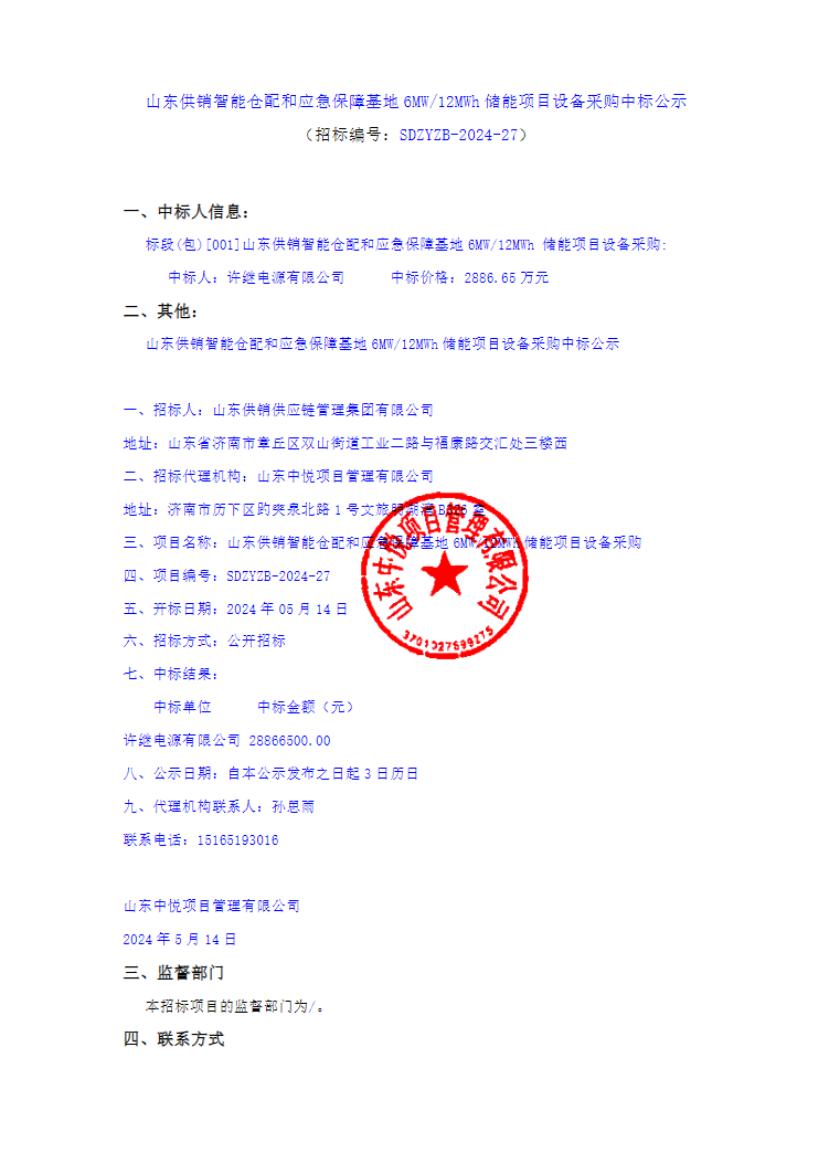 2.406元/Wh,許繼中標(biāo)山東6MW/12MWh儲(chǔ)能設(shè)備采購