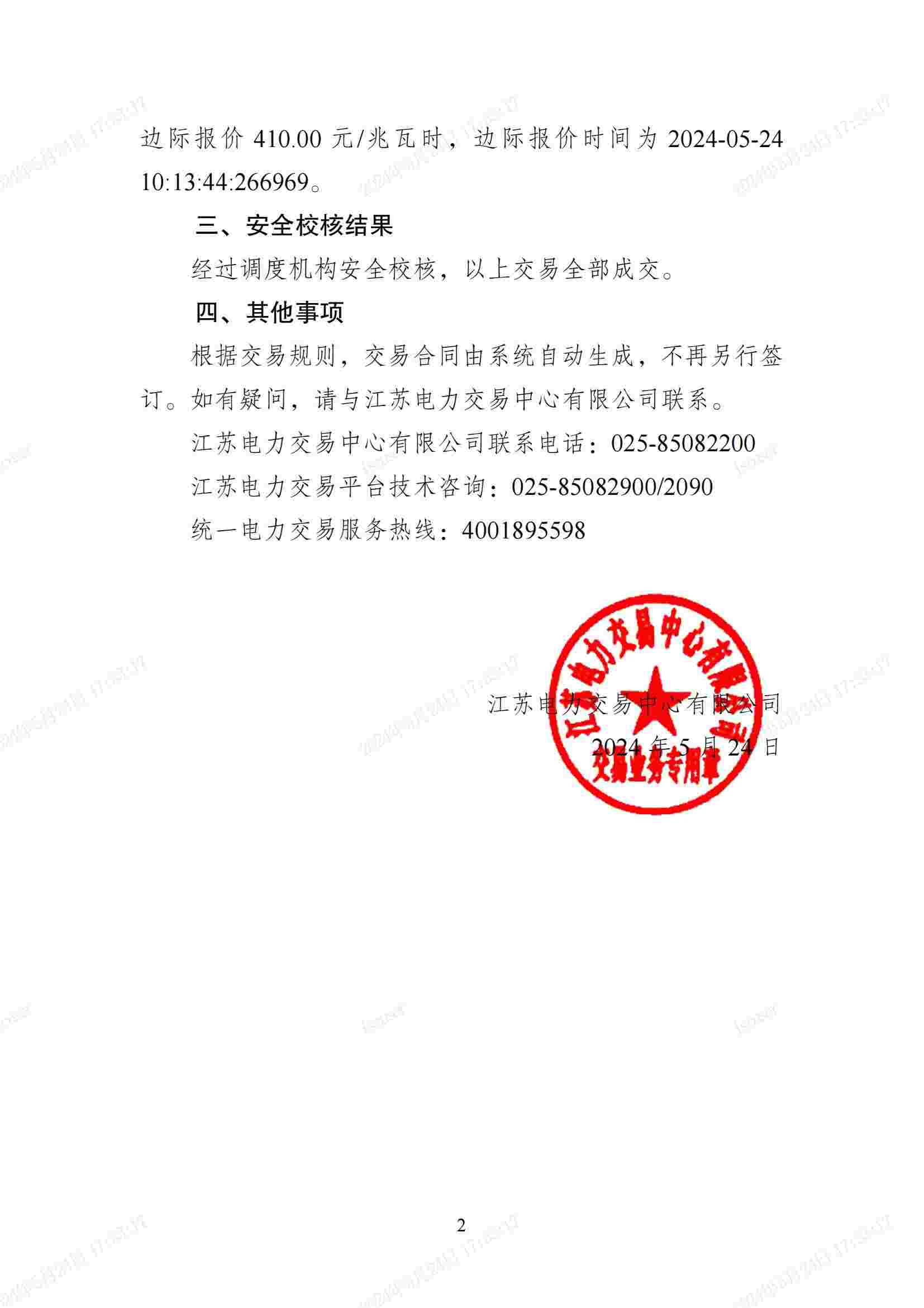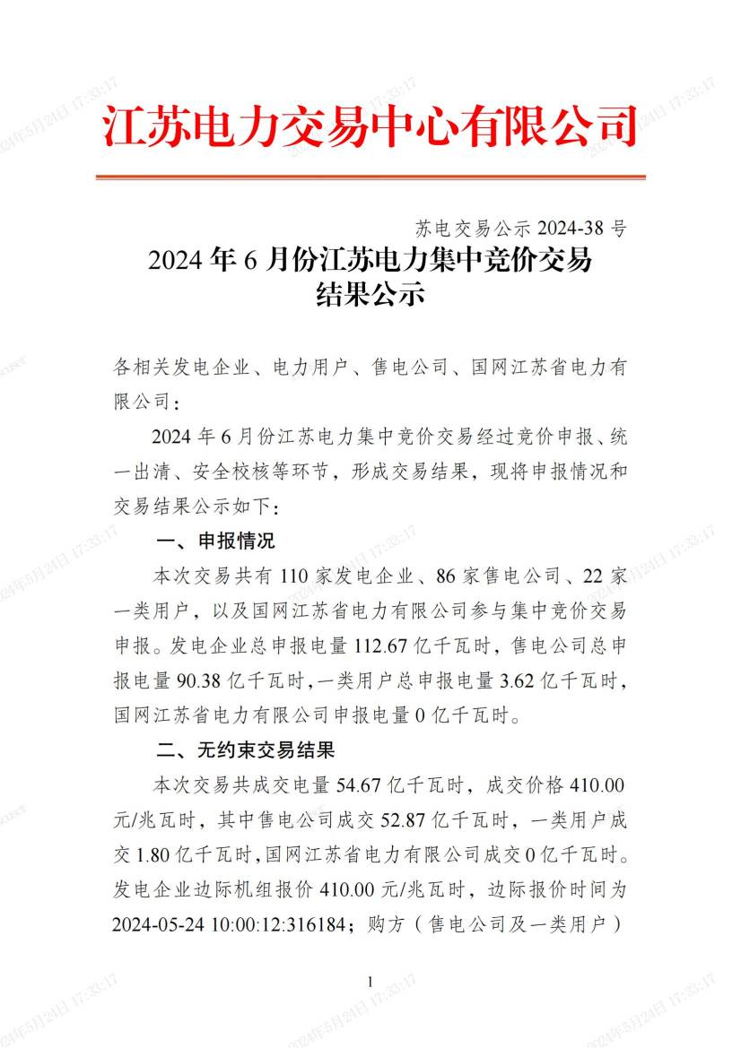 光伏園獲悉,近期,江蘇電力交易中心發(fā)布《2024年6月份江蘇電力集中競價交易結(jié)果公示》,本次交易共成交電量54.67億千瓦時,成交價格410.00元/兆瓦時。