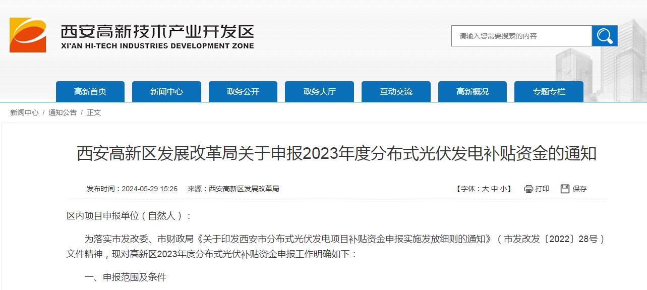 西安高新區(qū)發(fā)展改革局關(guān)于申報2023年度分布式光伏發(fā)電補貼資金的通知