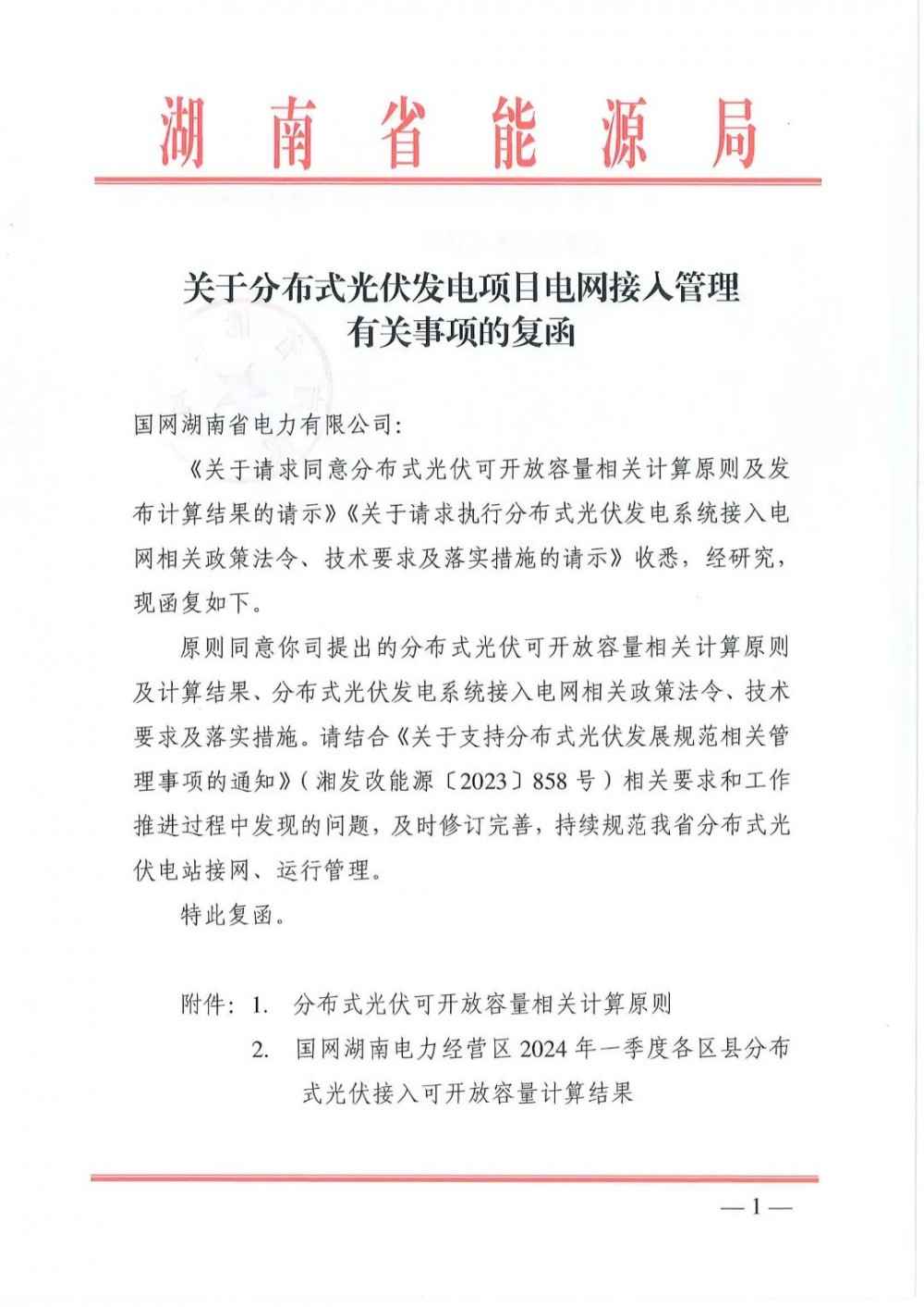 光伏園(www.uvhaut.com)獲悉,近期,湖南省能源局發(fā)布關(guān)于分布式光伏發(fā)電項(xiàng)目電網(wǎng)接入管理有關(guān)事項(xiàng)的復(fù)函。文件明確了國(guó)網(wǎng)湖南電力經(jīng)營(yíng)區(qū)2024年一季度各區(qū)縣分布式光伏接入可開(kāi)放容量。