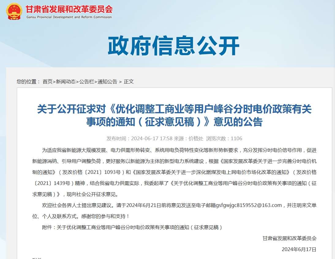 甘肅發(fā)布《優(yōu)化調(diào)整工商業(yè)等用戶峰谷分時(shí)電價(jià)政策有關(guān)事項(xiàng)的通知(征求意見稿)》