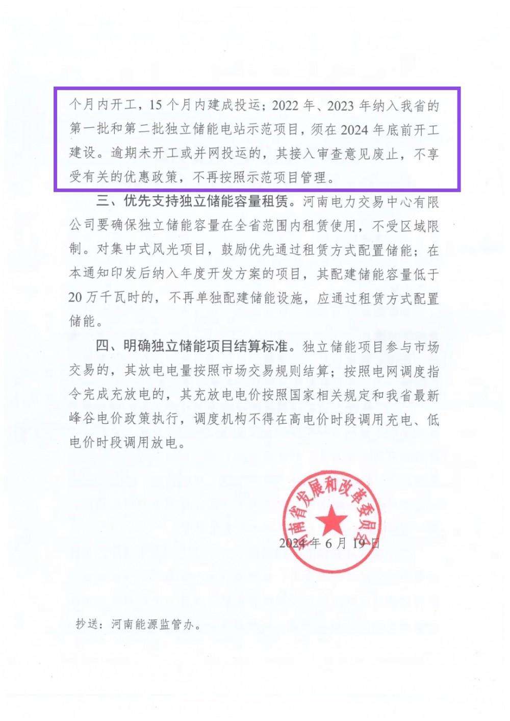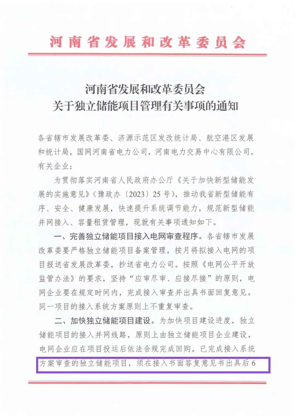 光伏園獲悉,近期,河南省發(fā)展和改革委員會正式發(fā)布《關于獨立儲能項目管理有關事項的通知》,通知要求:已完成接入系統(tǒng)方案審查的獨立儲能項目,須在接入書面答復意見書出具后6個月內開工,15 個月內建成投運;2022年、2023年納入河南省的第一批和第二批獨立儲能電站示范項目,須在2024年底前開工建設。逾期未開工或并網(wǎng)投運的,其接入審查意見廢止,不享受有關的優(yōu)惠政策,不再按照示范項目管理。