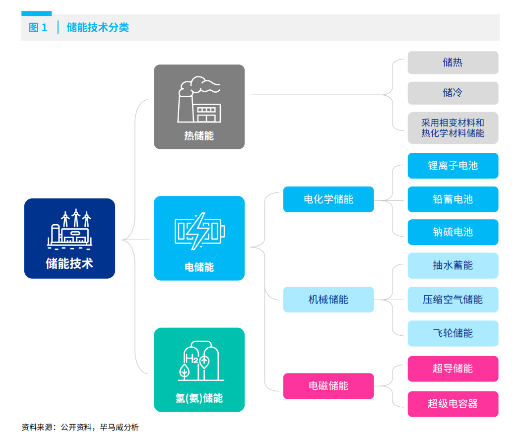 根據(jù)能量存儲形式的不同,廣義儲能技術(shù)主要分為熱儲能、電儲能、氫(氨)儲能三大類,其中電儲能包括電化學(xué)儲能、機(jī)械儲能和電磁儲能。目前在電力系統(tǒng)的儲能項目中,抽水蓄能仍是主要方式,但以電化學(xué)儲能為代表的多種新型儲能方式正迅猛發(fā)展。