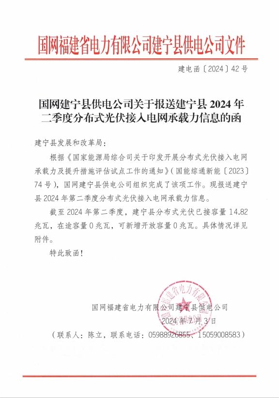 國網(wǎng)建寧縣供電公司關(guān)于報送建寧縣2024年二季度分布式光伏接入電網(wǎng)承載力信息的函