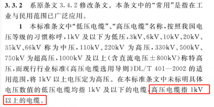 本標(biāo)準(zhǔn)條文中“低壓電纜”、“高壓電纜”名稱,按照我國電壓等級的習(xí)慣稱呼,1kV及以下為低壓,3kV、6kV、10kV、20kV、35kV、66kV稱為中壓,110kV、220kV為高壓,330kV、500kV、750kV為超高壓,1000kV及以上(含直流電壓士800kV)稱特高壓,而現(xiàn)行行業(yè)標(biāo)準(zhǔn)《高壓電纜選用導(dǎo)則》DL/T401一2002的適用范圍,將1kV以上電壓定為高壓。在本標(biāo)準(zhǔn)條文中未標(biāo)明具體電壓數(shù)值的低壓電纜均指1kV及以下的電纜,高壓電纜指1kV以上的電纜