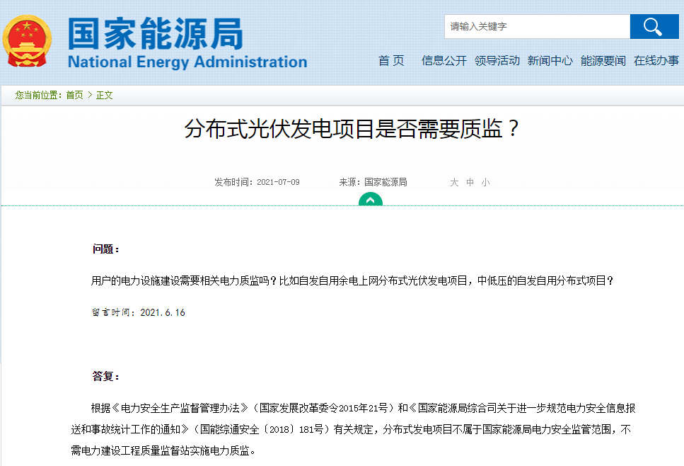 國(guó)家能源局答復(fù):根據(jù)《電力安全生產(chǎn)監(jiān)督管理辦法》(國(guó)家發(fā)展改革委令2015年21號(hào))和《國(guó)家能源局綜合司關(guān)于進(jìn)一步規(guī)范電力安全信息報(bào)送和事故統(tǒng)計(jì)工作的通知》(國(guó)能綜通安全〔2018〕181號(hào))有關(guān)規(guī)定,分布式發(fā)電項(xiàng)目不屬于國(guó)家能源局電力安全監(jiān)管范圍,不需電力建設(shè)工程質(zhì)量監(jiān)督站實(shí)施電力質(zhì)監(jiān)。